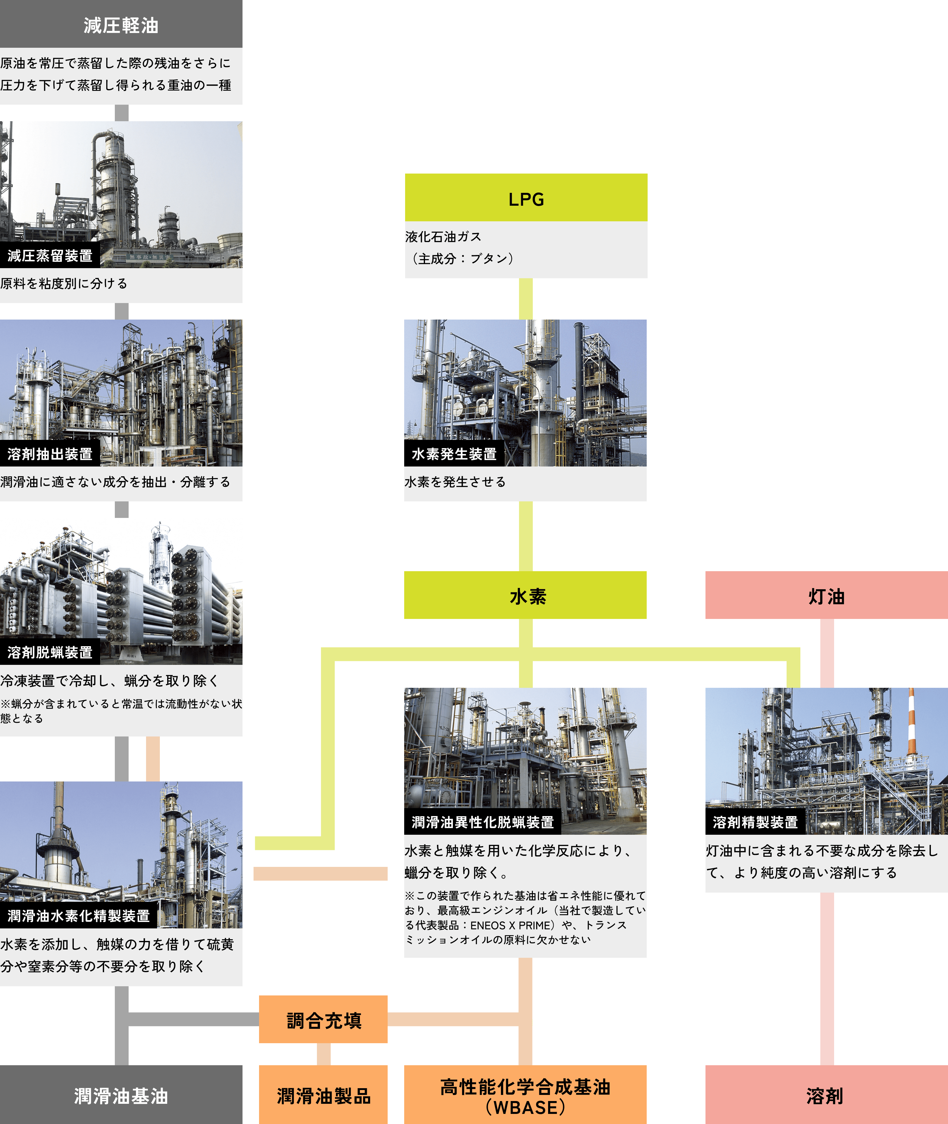 潤滑油は、原油から必要な成分を取り出し、不要物を丁寧に取り除くことで生産されます。そして、高純度の基油を用途に合わせて調合し、暮らしや産業を支える多様な潤滑油へと仕上げていきます。